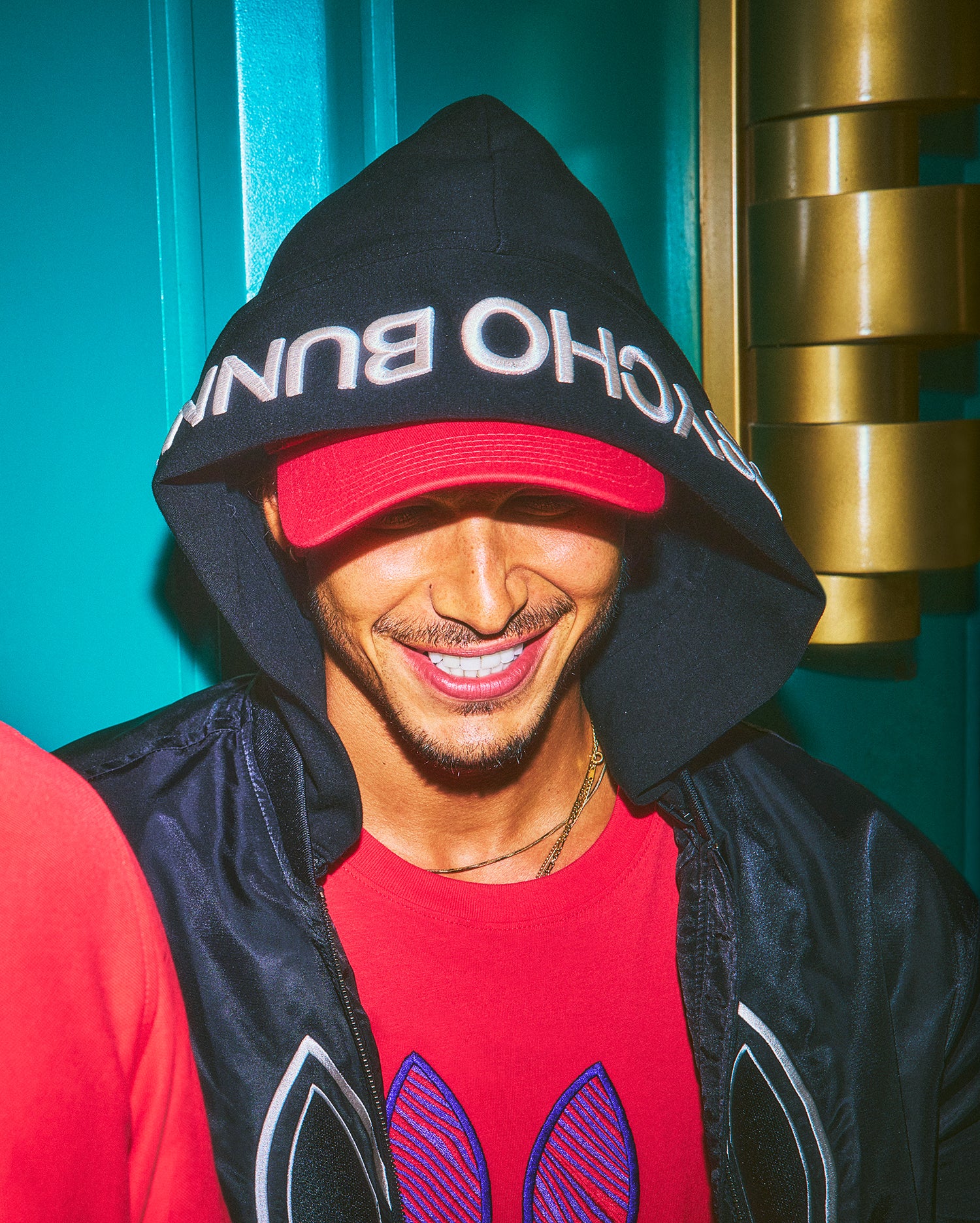 Embroidered wordmark at detachable jersey hood