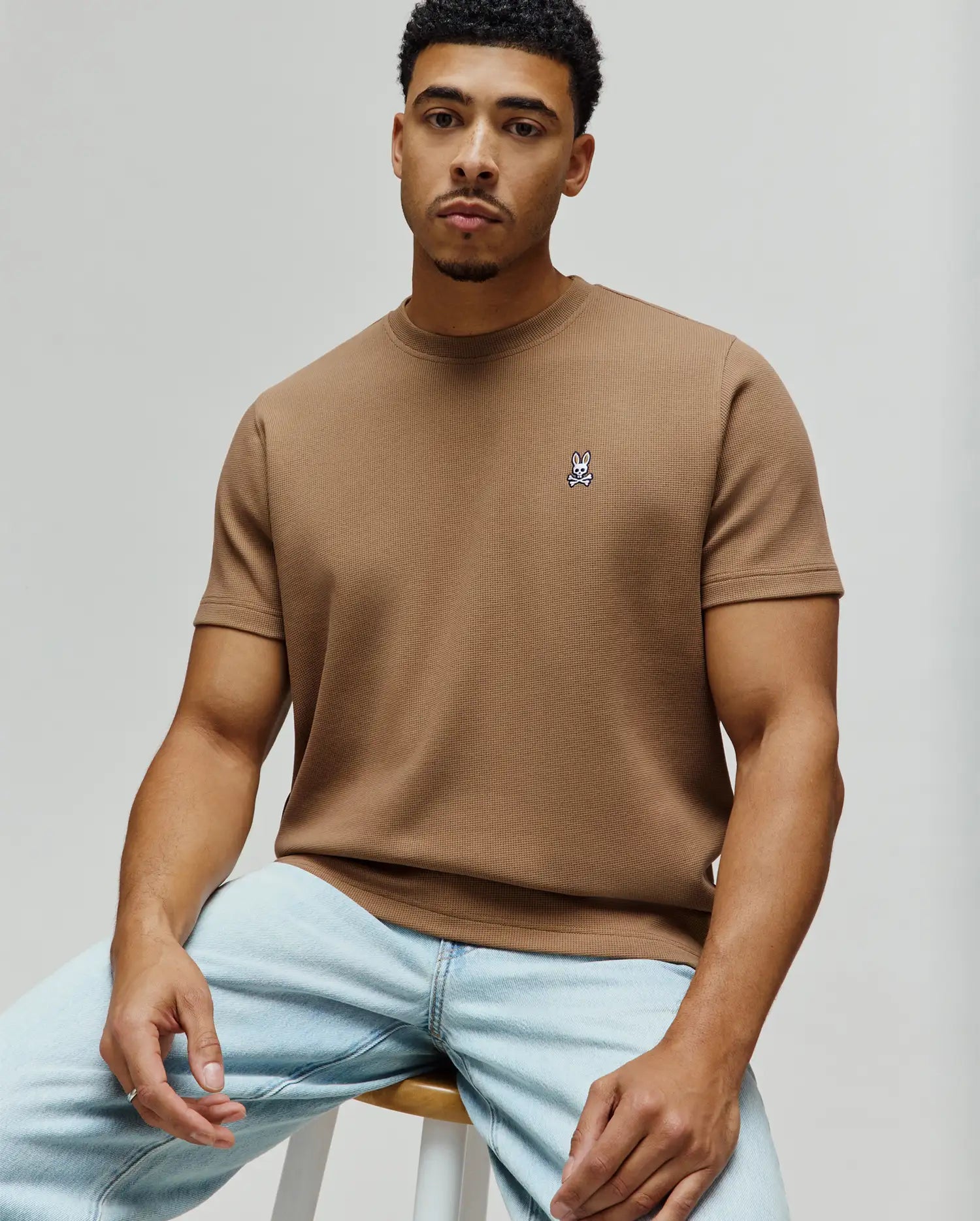 The Maxton Waffle Tee is knitted from a cotton blend. It features a textured waffle structure that gives visual depth and a soft feel.