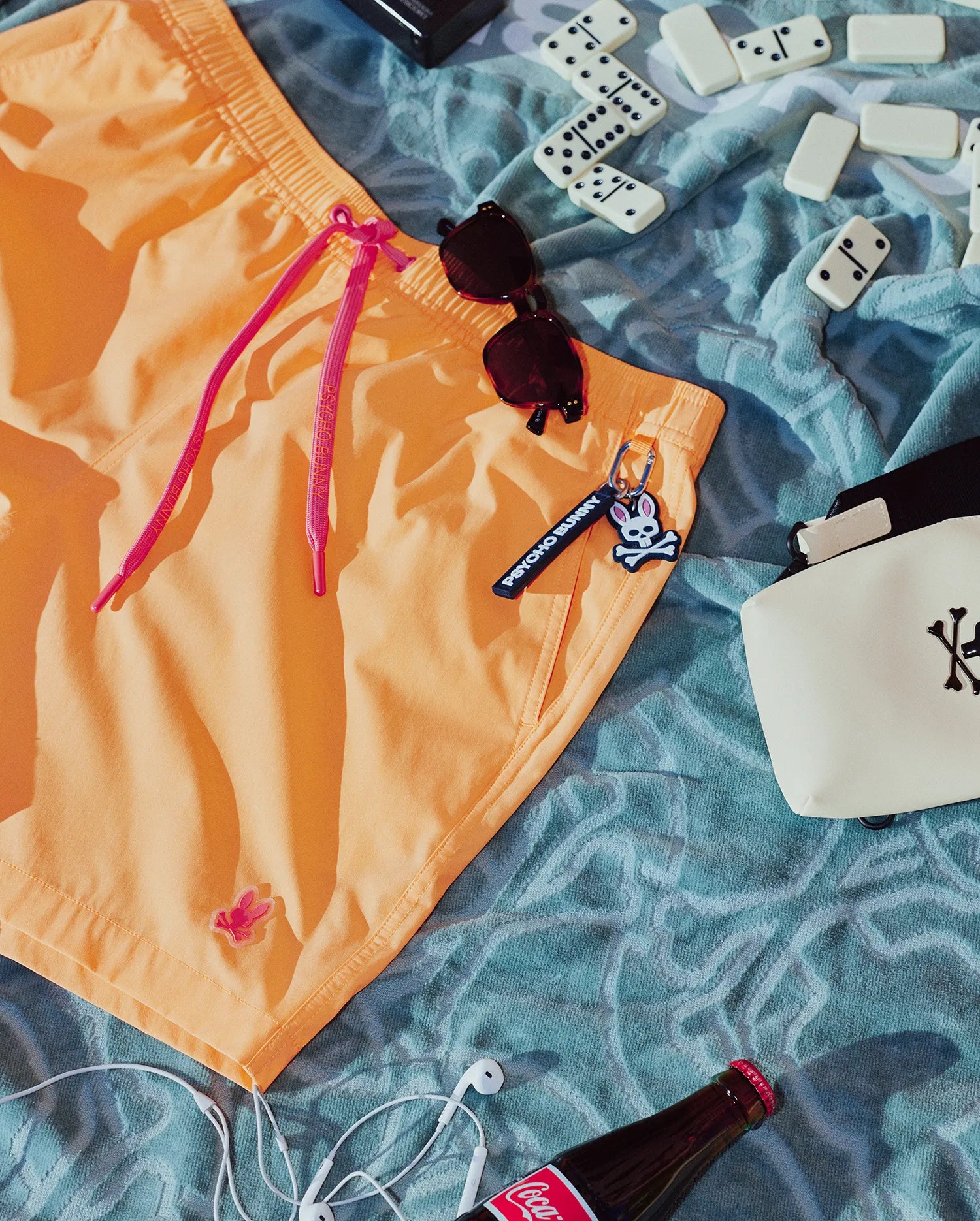 The Samos swim trunk features hydrochromic technology. which reveals a hidden Bunny pattern when the shorts come in contact with water. Mesh lining and a drawstring-stretch waistband allow for next-level comfort. Waterproof bag included in back pocket.